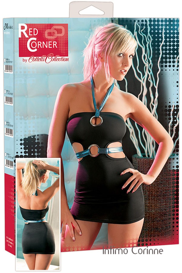 Mini abito nero a tubino con aperture laterali in vita e due tonde sul davanti contornate da un anello metallico cromato. Sostegno girocollo da legare sulla nuca e fascia in vita color azzurro metallizzato.