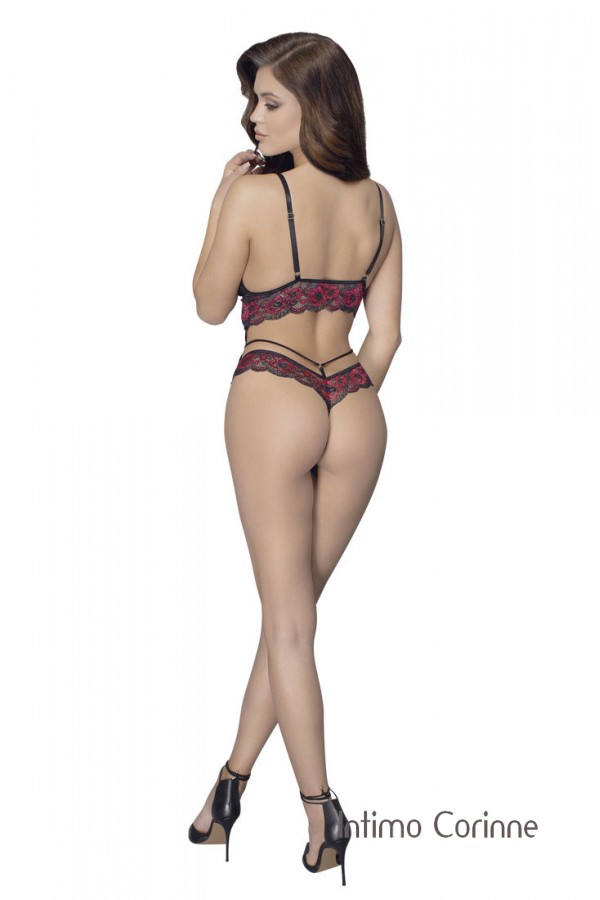 Seducente body in morbido tulle e pizzo floreale dai ricami rossi in contrasto abbellito con cinghie elastiche ed anelli decorativi sul decolletè e nella zona della vita. Grazioso design a due pezzi sul retro, aperturuta al cavallo e spalline regolabili.