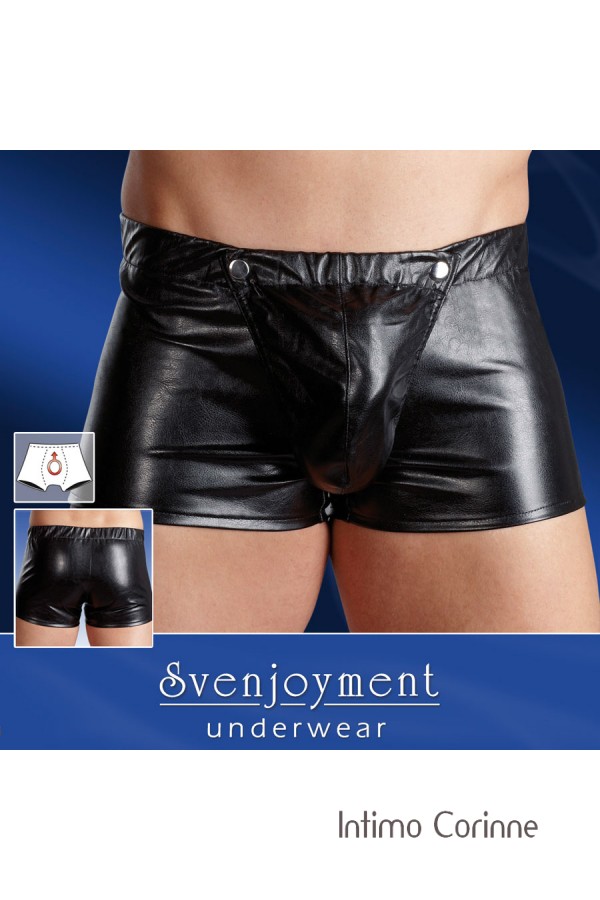 Boxer neri in ottima pelle sintetica con effetto push-up anteriore dovuto alla speciale conformazione dell'inserto frontale completamente removibile mediante 3 bottoni a pressione. Comodo elastico in vita.