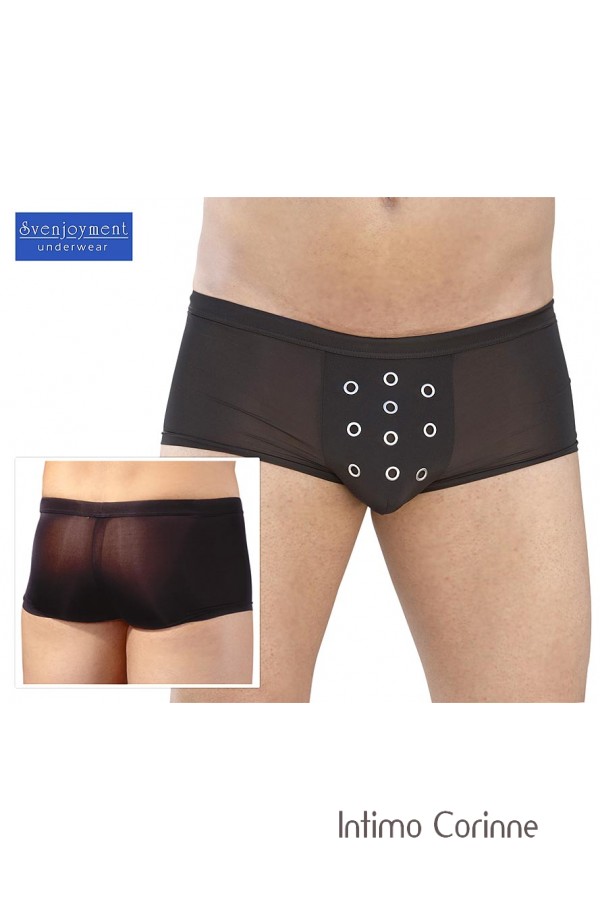 Boxer uomo semitrasparenti in tessuto satinato con occhielli decorativi colore argento nella parte anteriore. Gli occhielli non sono passanti in quanto è presente un ulteriore strato di tessuto che li separa dalle parti intime. Colore nero.