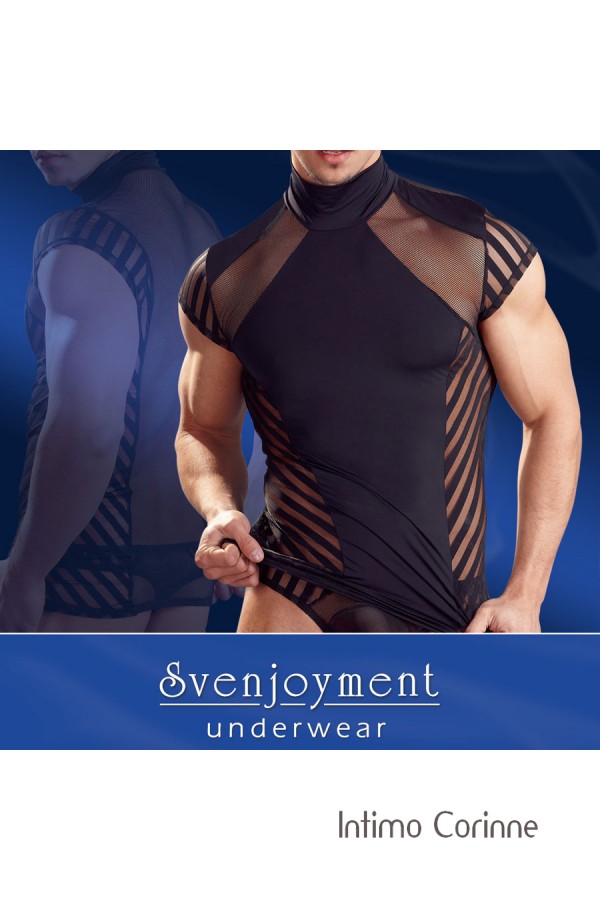 Canotta da uomo, semi coprente con collo alto. Tessuto morbido ed elasticizzato. Design originale con inserti a rete e motivi a righe.