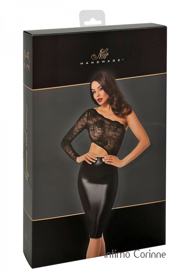 Questo abito midi asimmetrico fonde la morbidezza del pizzo con l'eleganza del tessuto Powerwetlook, creando un look unico e sorprendente. Pensato per chi apprezza un mix di texture, questo capo è perfetto per fare una dichiarazione di moda audace. Il top è realizzato in pizzo elastico, è quindi trasparente ed offre un seducente scorcio di pelle mantenendo un aspetto elegante. La parte inferiore è invece realizzata in tessuto elasticizzato Powerwetlook, che offre una vestibilità morbida e aderente al corpo, accentuando le curve. Il design asimmetrico monospalla crea una silhouette accattivante mentre il ritaglio strategico in vita aggiunge un tocco di grinta. Il vestito arriva appena sotto il ginocchio, offrendo una lunghezza sofisticata che contrasta splendidamente con il top più trasparente.