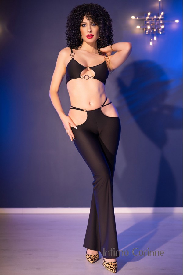 Un set sensuale e irresistibilmente elegante che affascina con la sua finezza. Il tessuto morbido e delicato abbraccia il corpo, mettendone in risalto le caratteristiche migliori. Il top, impreziosito da anelli dorati, aggiunge un tocco di eleganza mentre i pantaloni con curiosi ritagli laterali, rivelano i fianchi attirando l'attenzione anche dei più "distratti". I dettagli dorati completano il look, aggiungendo un tocco di lusso. L'outfit perfetto per le donne sicure di sé che amano flirtare con classe!