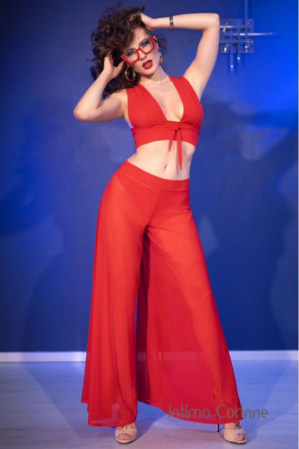 Ecco un set che accenderà i sensi! 🔥 Un top che può essere allacciato in più modi, consentendo una sperimentazione seducente e mettendo in risalto le vostre caratteristiche migliori. I pantaloni a gamba larga aggiungono un tocco di eleganza mentre il tanga in trasparenza completa il look audace e sensuale. Realizzato in morbido tessuto rosso velato ed elasticizzato, questo set si adatta al vostro corpo lasciando solo un po' di spazio all'immaginazione... ✨💫 Pronte a giocare con il desiderio? 😈🔥