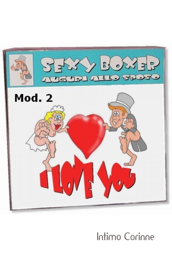 Boxer sposo spiritoso, bianco con disegno e scritta + condom. Confezione in scatola trasparente.