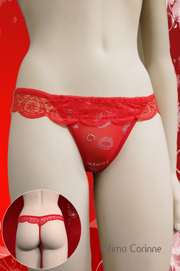Perizoma rosso in tulle con cuori e baci argentati. Volant in pizzo lungo il girovita. Tassello in cotone.