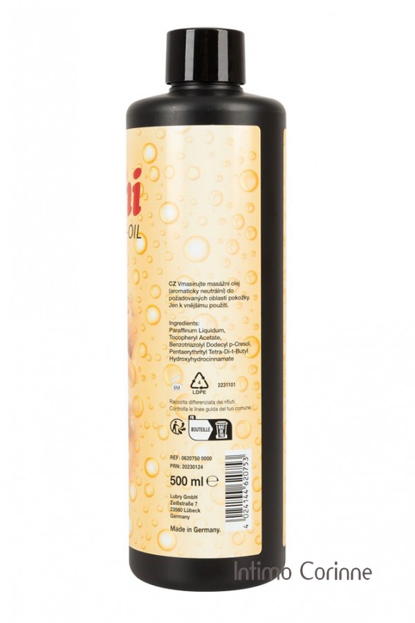 Olio per massaggi da mezzo litro. Morbido nella consistenza, Flutschi garantisce un piacere scivoloso a lunga durata senza appiccicare! Senza odore e privo di gusto. 500 ml.