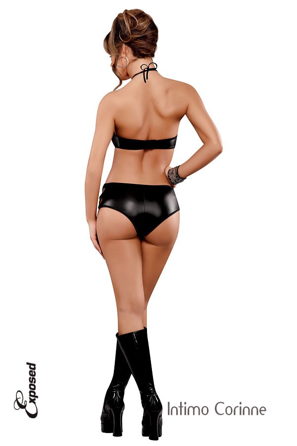 Completo in tessuto lucido nero composto da slip modello brasiliana con anelli di giunzione sui fianchi, reggiseno con chiusura posteriore, stringhe incrociate con anello sul decolleté ed allacciatura dietro il collo.
