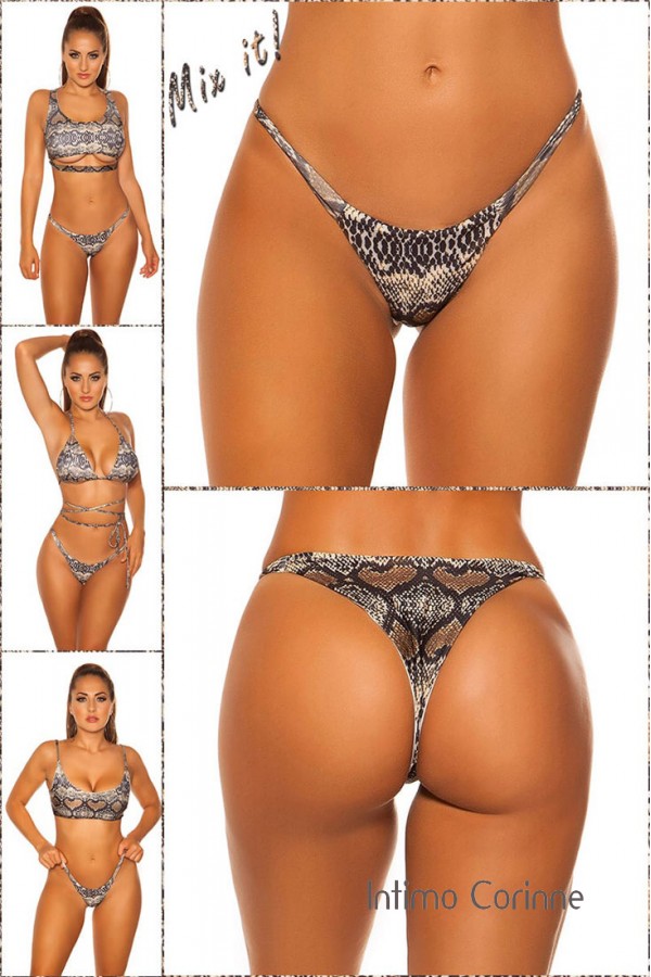 Tanga bikini brasiliano pitonato con lacci laterali.