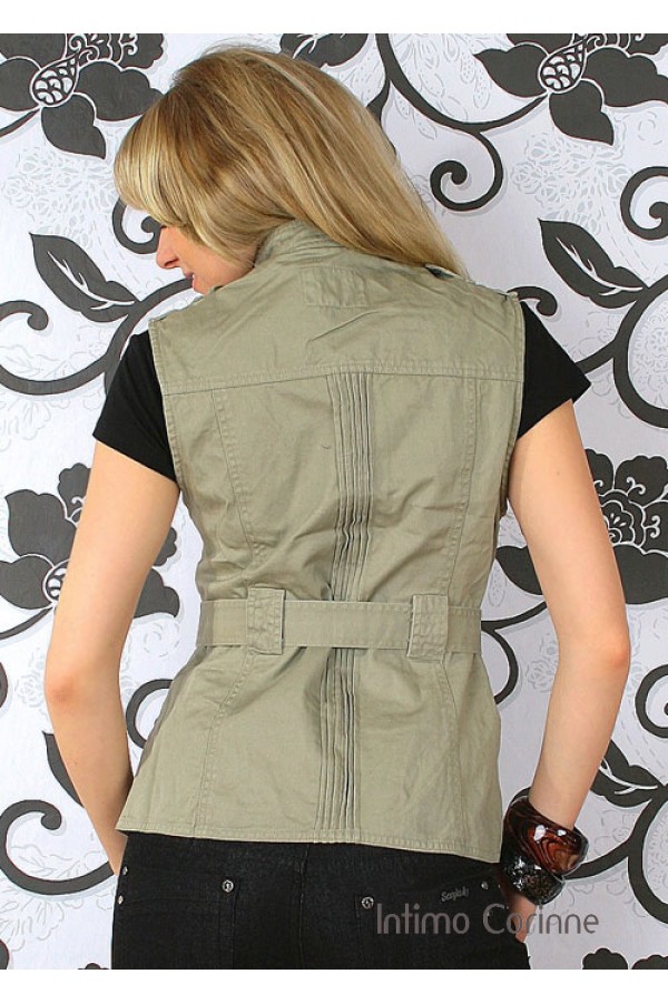 Smanicato lungo in tessuto jeans con bottoni color bronzo, 4 tasche frontali e cintura in vita da annodare. Color verde chiaro.