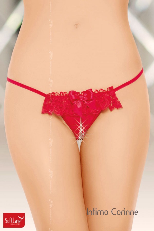 Slip elasticizzato in microrete rossa, aperto davanti e posteriormente, con fiocchetto in satin centrale e volant in pizzo sul bordo superiore.