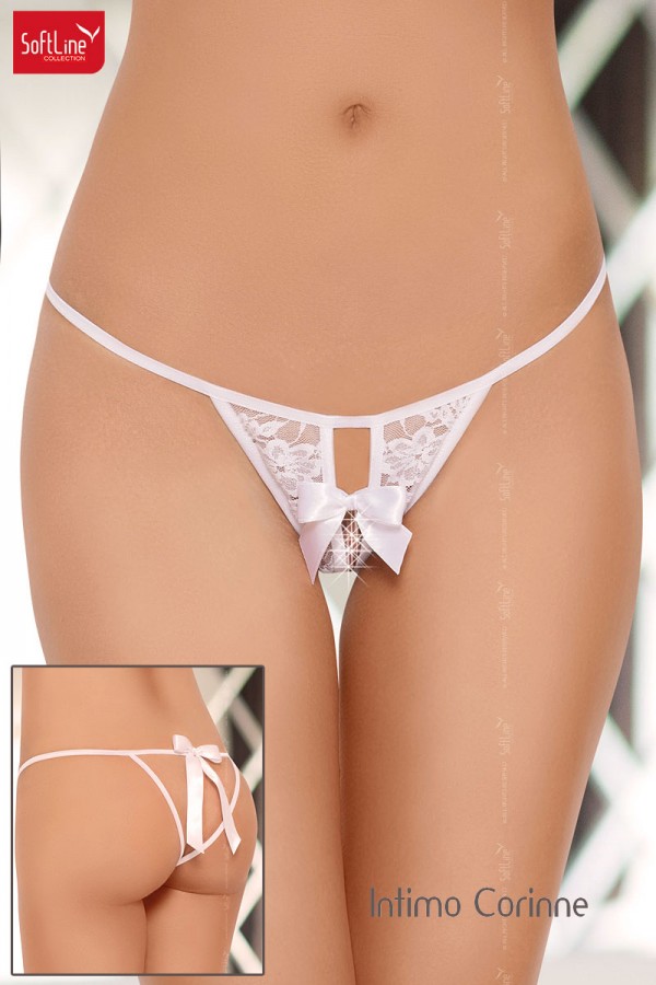 Tanga aperto in pizzo con fiocco in satin cucito davanti e dietro. Aperto al cavallo. Colore bianco.