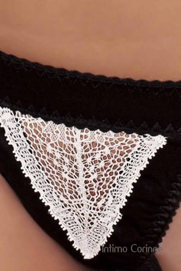 Particolare tanga nero con bordi in tessuto satin elasticizzato ed arricciato impreziosito da un inserto centrale in morbido pizzo bianco in contrasto. Parte posteriore tutta nera con piccolo triangolino.