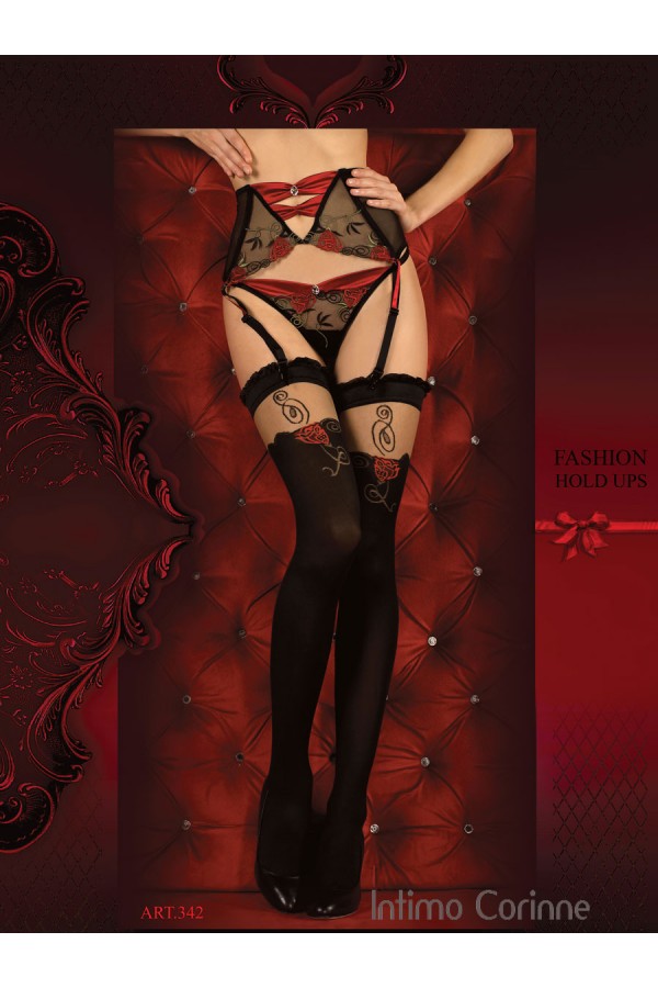 Calze autoreggenti nere/beige in Lycra con balza siliconata e disegno rosa. Filato setificato da 20/60 denari.
