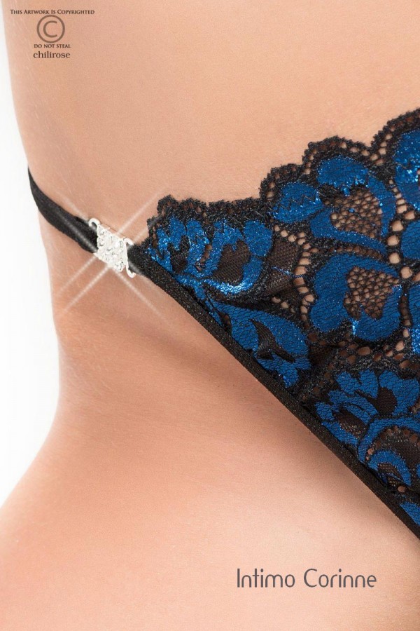 Tanga in morbido pizzo floreale nero/blu zaffiro arricchito con piastrine di giunzione tempestate di lucenti strass. Triangolino posteriore che riprende lo stesso tessuto del triangolo anteriore. Tassello in cotone.