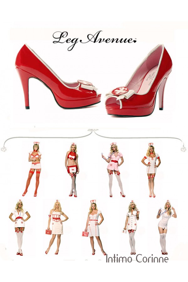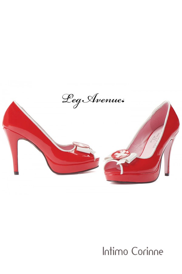 Scarpe da crocerossina. Colore rosso con bordi bianchi, aperta davanti e fiocco con simbolo croce sulla punta.