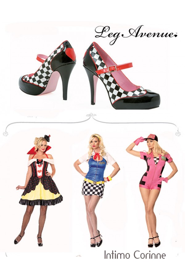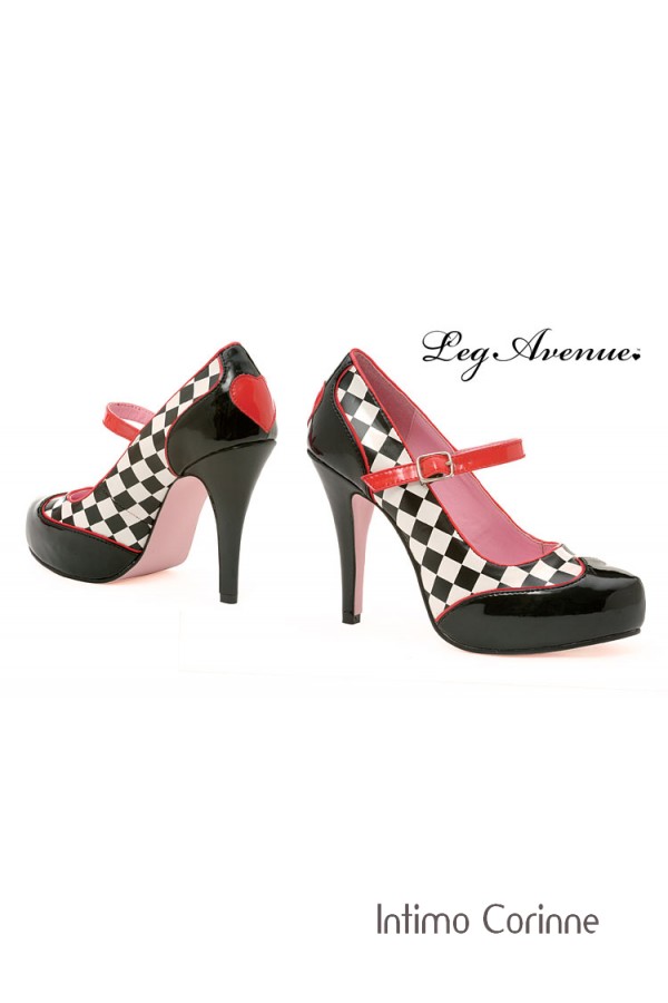 Scarpe nere con parte centrale a scacchi bianco/nero. Rifiniture rosse con cuore cucito nel tallone e cinghietto regolabile nero.