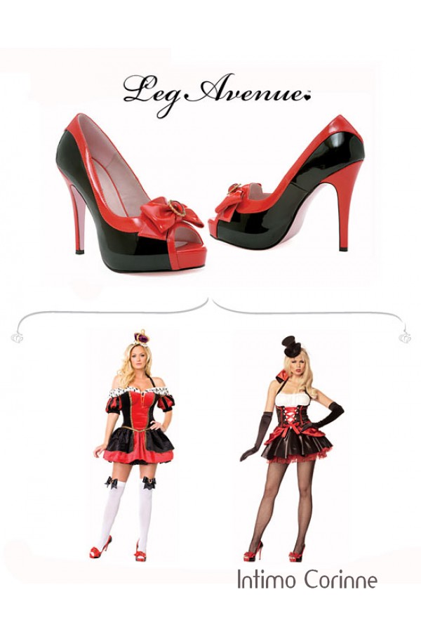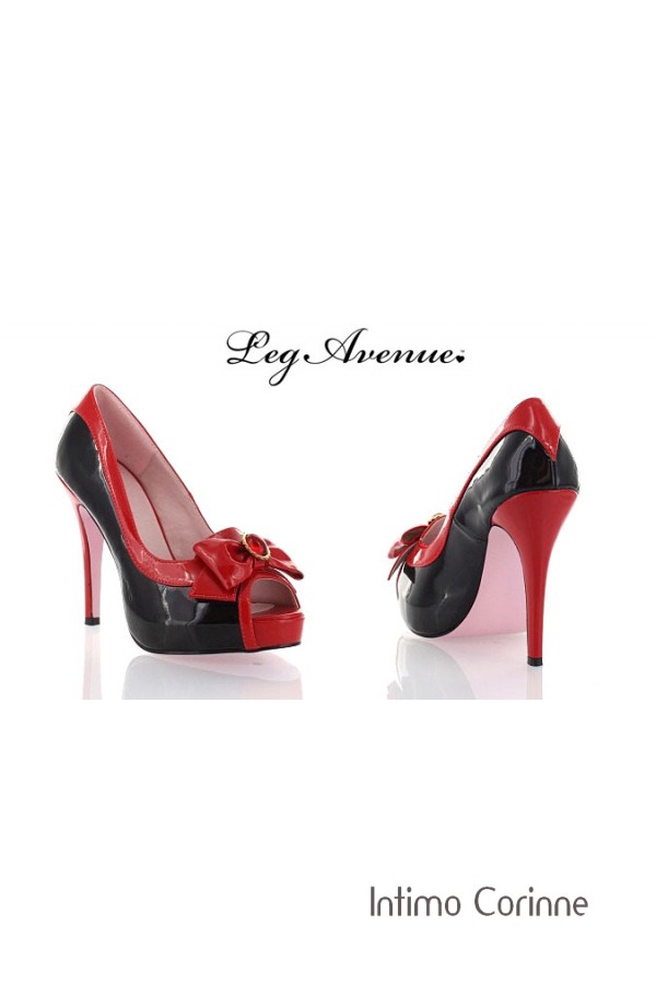 Scarpe nere aperte in punta con bordi e fiocco rossi contrastanti.