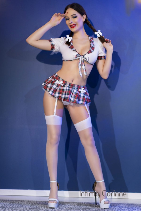 Travestimento da scolaretta sexy in tessuto elasticizzato bianco e fantasia scozzese abbellito con fiocchi in satin. Il set comprende top da legare davanti, gonnellino con sottogonna in tulle bianco, 4 reggicalze removibili, tanga, cravattino, coppia di fiocchetti per i capelli con elastico e calze bianche velate.
