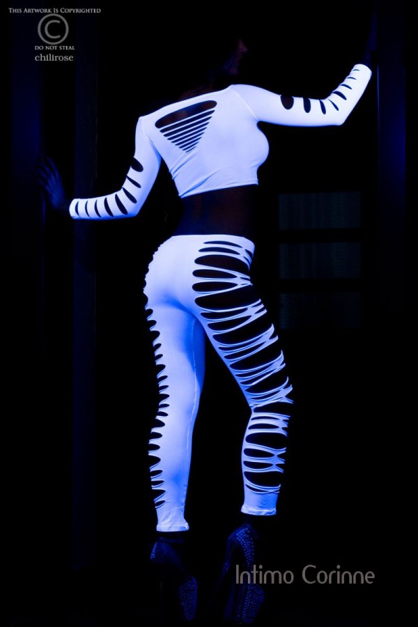 Sensuale completo 2 pezzi in ottimo tessuto bianco elasticizzato. Top con taglio a barchetta caratterizzato da generosa apertura stringata sul decolletè e maniche a 3/4 con intagli laterali. Leggings coordinati con ampie stringature laterali. Tessuto fluorescente se esposto sotto la lampada di Wood (luce nera).