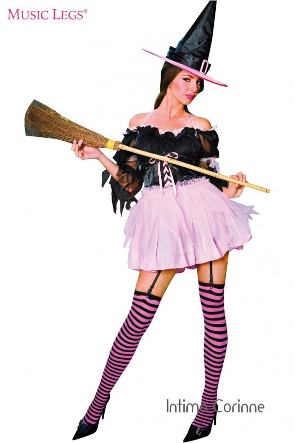 Costume strega composto da miniabito nero-rosa in tessuto coprente e tulle con scollo a barchetta, maniche sfrangiate e parte inferiore multistrato con sottogonna semirigida. Stringatura anteriore ornamentale e cerniera nascosta sulla schiena. Cappello ed accessori esclusi.
