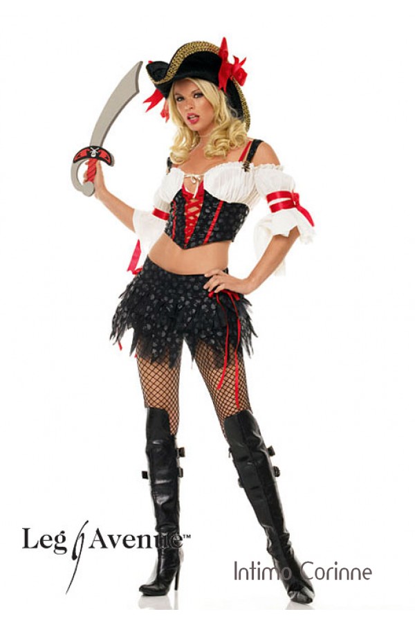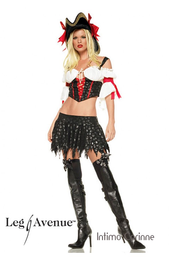 Costume pirata 2 pezzi bianco e nero con fantasia teschi. Comprende top alla contadina con stringatura centrale e lacci al braccio rossi, chiusura posteriore con tre fila di gancetti ed ornamento teschio sulle spalline. Gonna con doppio bordo frastagliato, zip laterale a scomparsa e 4 reggicalze regolabili. (Esclusi spada e cappello).