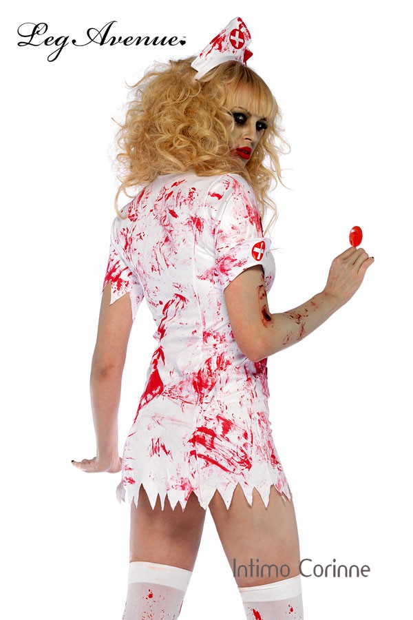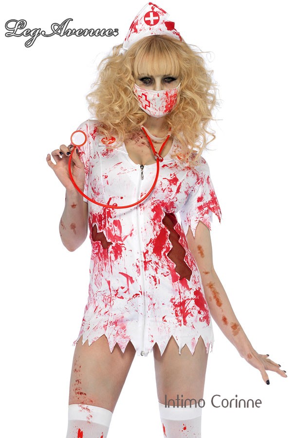 Costume 3 pezzi infermiera zombie. Comprende vestito con inserti irregolari in microrete effetto tagli, chiusura anteriore tramite zip e toppe con croce cucite su colletto e manica. Include bavaglio e cerchietto coordinato. Calze e stetoscopio esclusi.