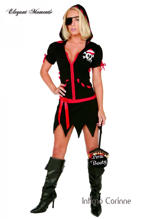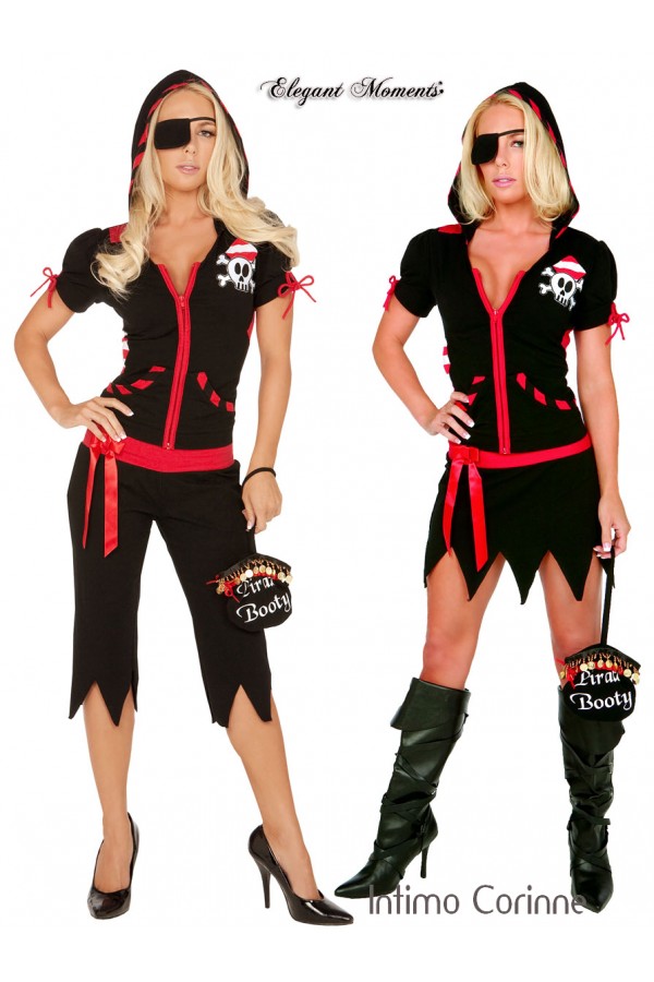 Travestimento da pirata col bottino composto da 5 pezzi. E' costituito da una felpa nera a maniche corte con cappuccio, munita di cerniera anteriore ed abbellita da toppe con teschio e rifiniture rosse; comprende benda occhio e borsetta con scritta Pirate Booty (bottino del pirata) impreziosita da pendenti con monetine. La parte inferiore include sia un pinocchietto che una gonna, entrambi con bordo inferiore frangiato e fiocco rosso sul girovita.