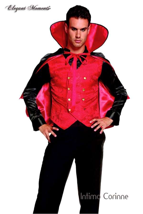 Costume uomo vampiro 2 pezzi. Comprende camicia nera a maniche lunghe in tessuto lucido con annesso gilet rosso ricamato con bottoni dorati e mantella bicolore con colletto alto rigido. Pantaloni non inclusi.