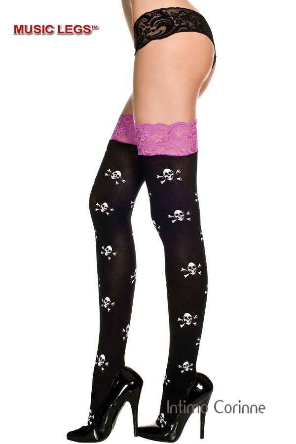 Calze da reggicalze nere coprenti motivo teschi con ossa incrociate e balza in pizzo viola.