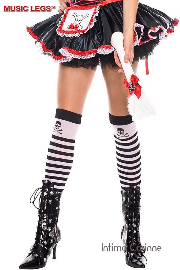 Calze opache bianche/nere a righe orizzontali con teschio ed ossa incrociate disegnate sotto la balza elastica.