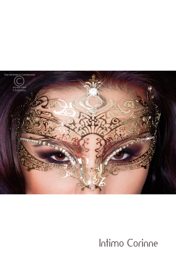Originale maschera dorata metallica filigranata, anatomica e flessibile, impreziosita da numerose applicazioni di strass. Legatura mediante fettucce nere in raso.