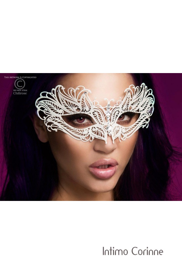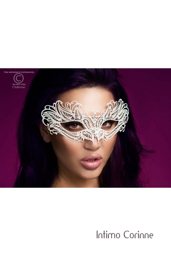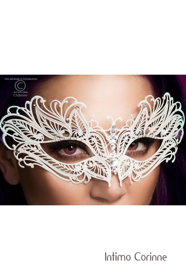Originale maschera bianca metallica filigranata, anatomica e flessibile, impreziosita da numerose applicazioni di strass. Legatura mediante fettucce bianche in raso.