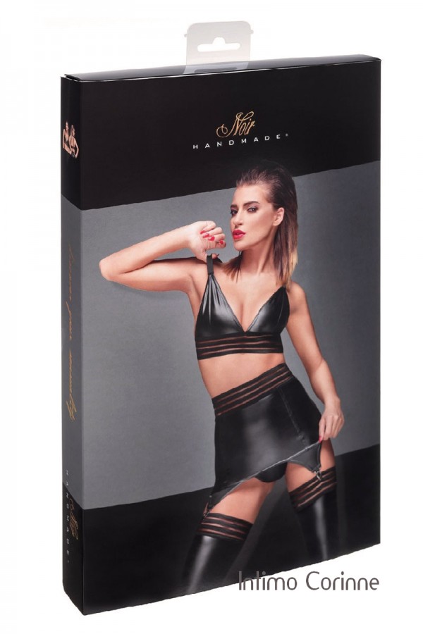 Reggiseno a triangolo in morbido tessuto elastico semilucido con fascia sottoseno a righe elasticizzata e bretelle regolabili. Chiusura posteriore tramite tre gancetti. Slip e calze acquistabili separatamente.