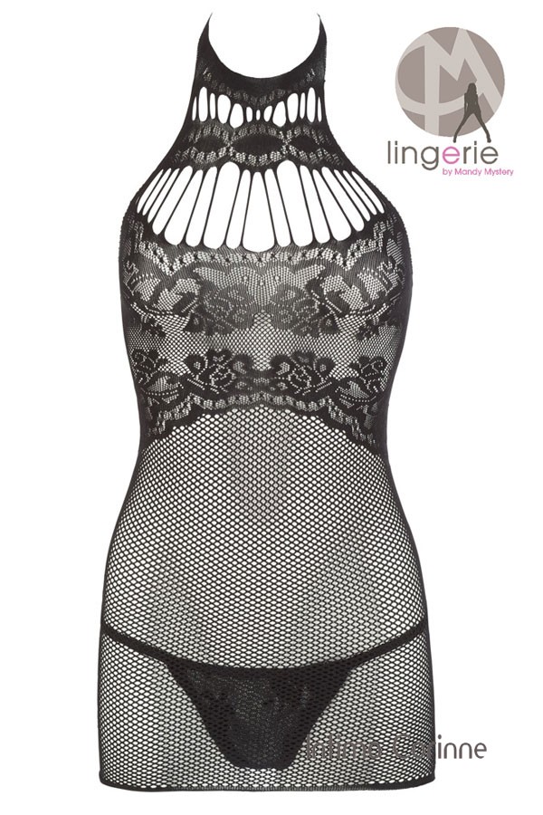 Mini abito nero realizzato in morbida rete elastica con ricami floreali lungo la fascia sul seno e stringhe elastiche nella parte superiore. Ha un girocollo cucito su di esso e uno sguardo di pizzo sensuale nell'area di scissione. Include una stringa di pizzo.