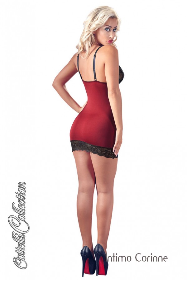 Chemise rossa in tessuto elasticizzato con inserti di pizzo e stringatura anteriore con fiocchetto. Bretelline regolabili.