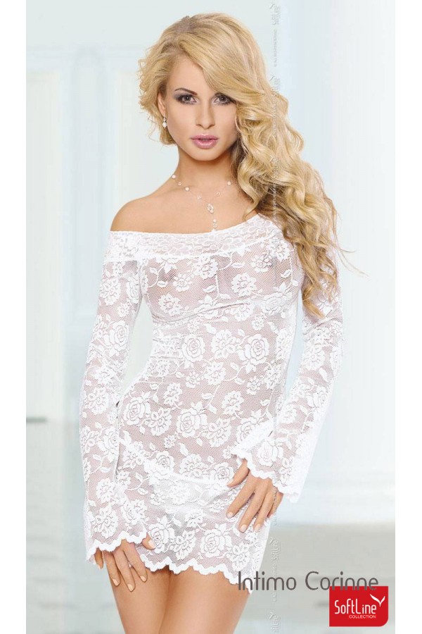 Splendida chemise a maniche lunghe leggermente scampanate realizzata in morbido pizzo floreale elasticizzato. Caratterizzata da uno scollo a barchetta che lascia le spalle scoperte con merletto di rifinitura lungo il bordo superiore. Colore bianco.