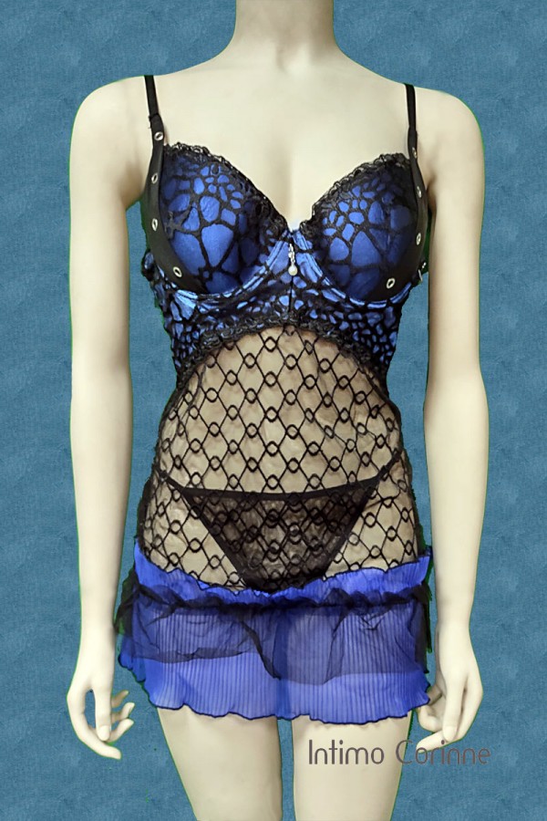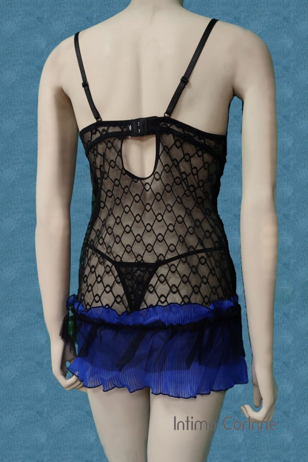 Chemise in microrete nera con volants lungo il bordo inferiore, ricami a nido d'ape, inserti frontali in tessuto blu elettrico e coppe imbottite effetto push-up munite di ferretto con borchie ornamenali ai lati. Spalline e chiusura posteriore regolabili.