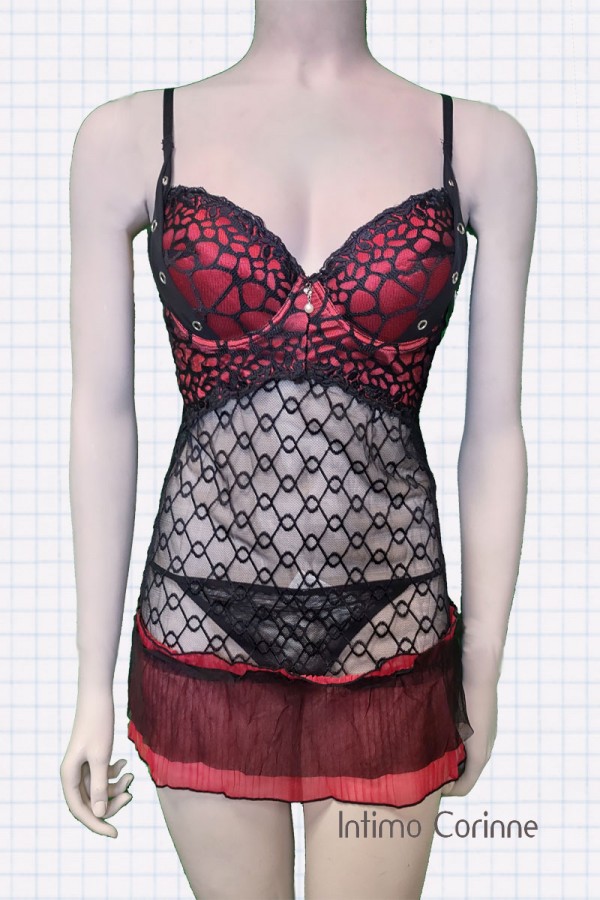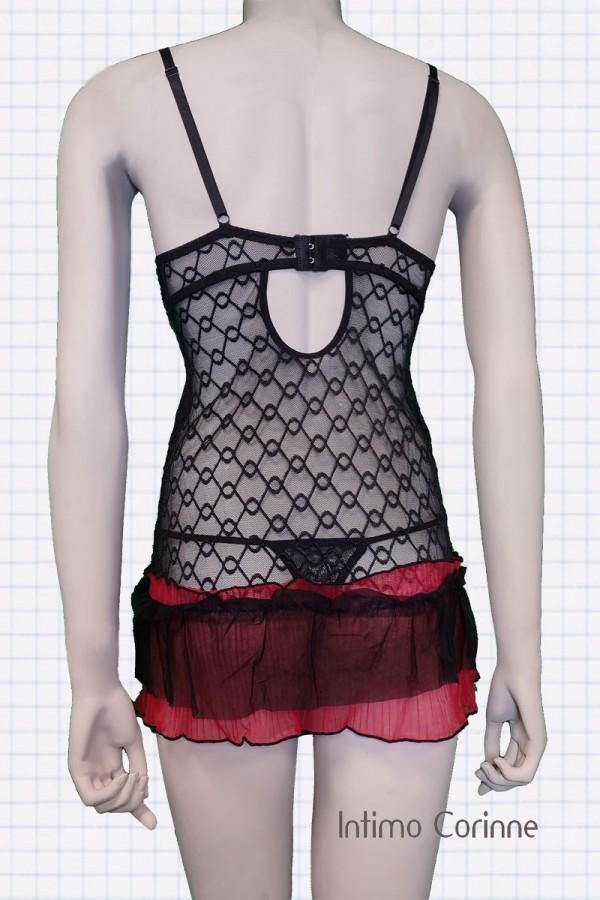Chemise in microrete nera con volants lungo il bordo inferiore, ricami a nido d'ape, inserti in tessuto rosso e coppe imbottite effetto push-up munite di ferretto con borchie ornamenali ai lati. Spalline e chiusura posteriore regolabili.