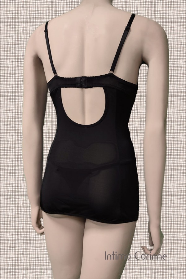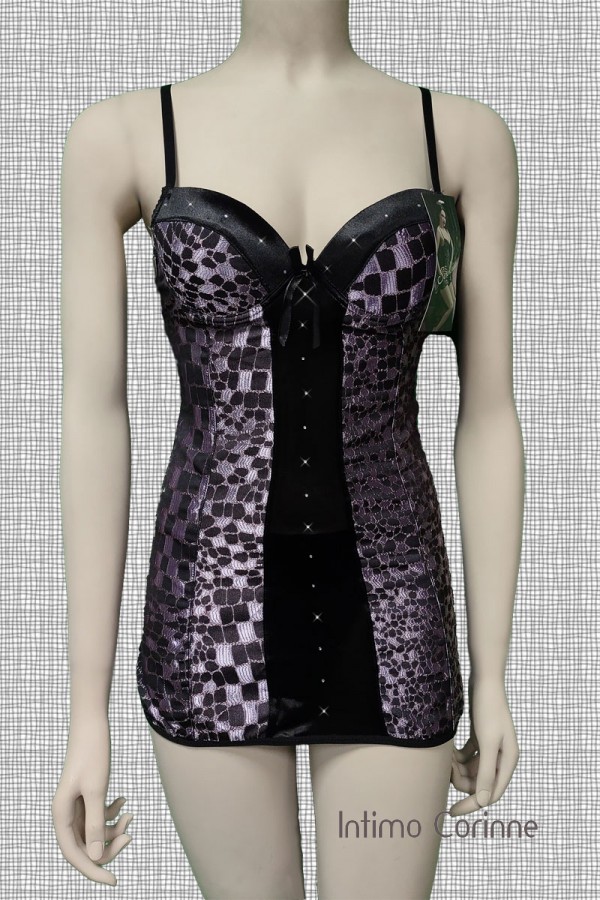 Chemise in tessuto nero elasticizzato caratterizzata anteriormente da sontuosi ricami viola/lilla semilucidi in fantasia mosaico con piccoli strass lungo il busto ed il bordo superiore. Coppe imbottite munite di ferretto con spalline e chiusura posteriore regolabili.
