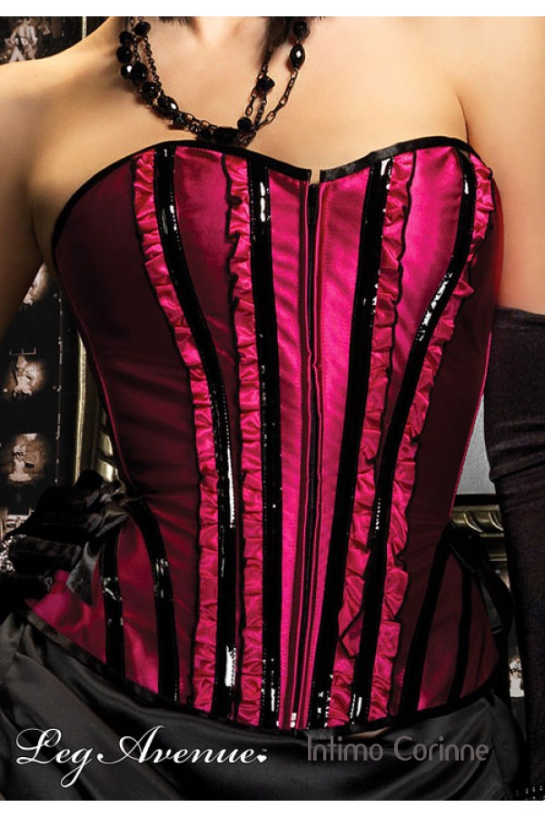 Corsetto Betty in raso con volant plissettati. Stecche di sostegno e rifiniture in vinile. Chiusura anteriore tramite zip e regolazione tramite stringature posteriore. Gonna non inclusa.