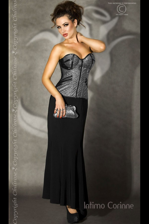 Scintillante corpetto in morbida ecopelle nera ricoperto nella parte anteriore da tessuto brillante argentato. Coppe imbottite munite di ferretto, otto stecchette di sostegno, stringatura posteriore regolabile e chiusura anteriore mediante cerniera.