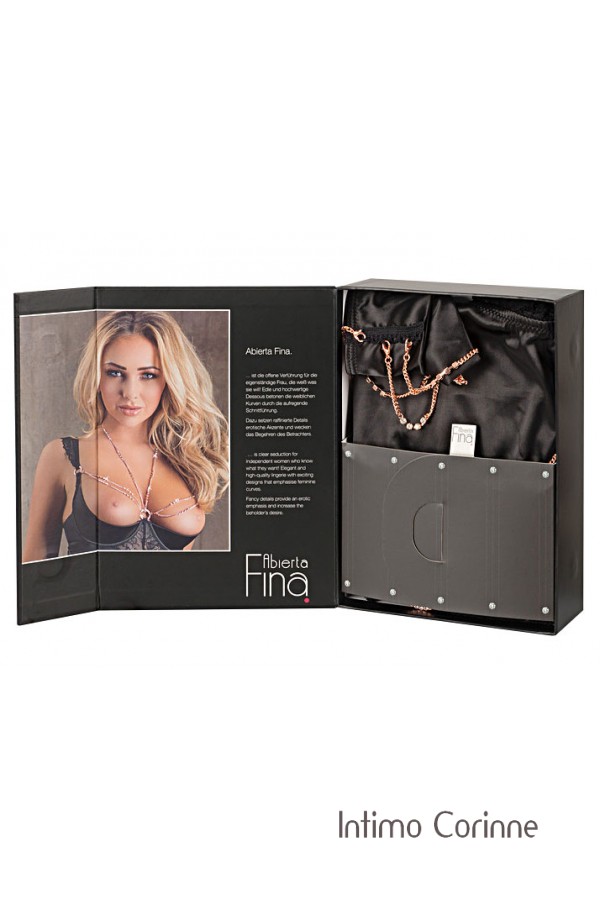Elegantemente erotico! Body dal taglio mozzafiato di Abierta Fina con invitante cavallo aperto. Realizzato interamente in pizzo fine che aderisce dolcemente al corpo. L'ampio inserto in vita realizzato in solido raso elasticizzato crea una bella silhouette. Extra scollato sul davanti, la vista posteriore seduce anche con una profonda scollatura a V. L'ampia scollatura e l'imbracatura a catena per il collo e la vita enfatizzano questo look di pizzo eroticamente elegante. Le catene di moschettoni in oro rosa tempestate di strass possono anche essere rimosse.
