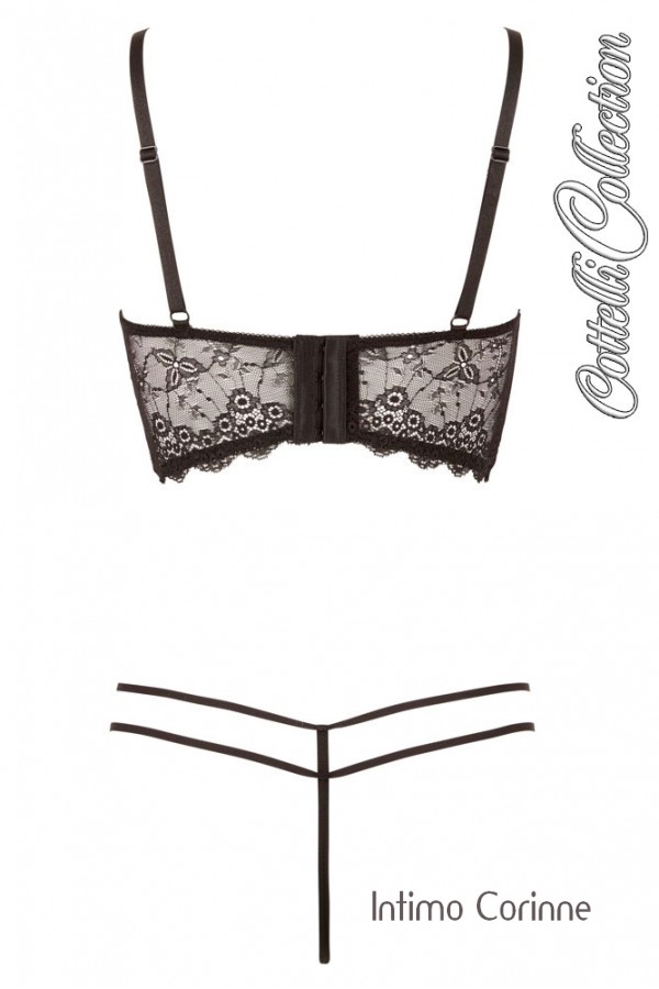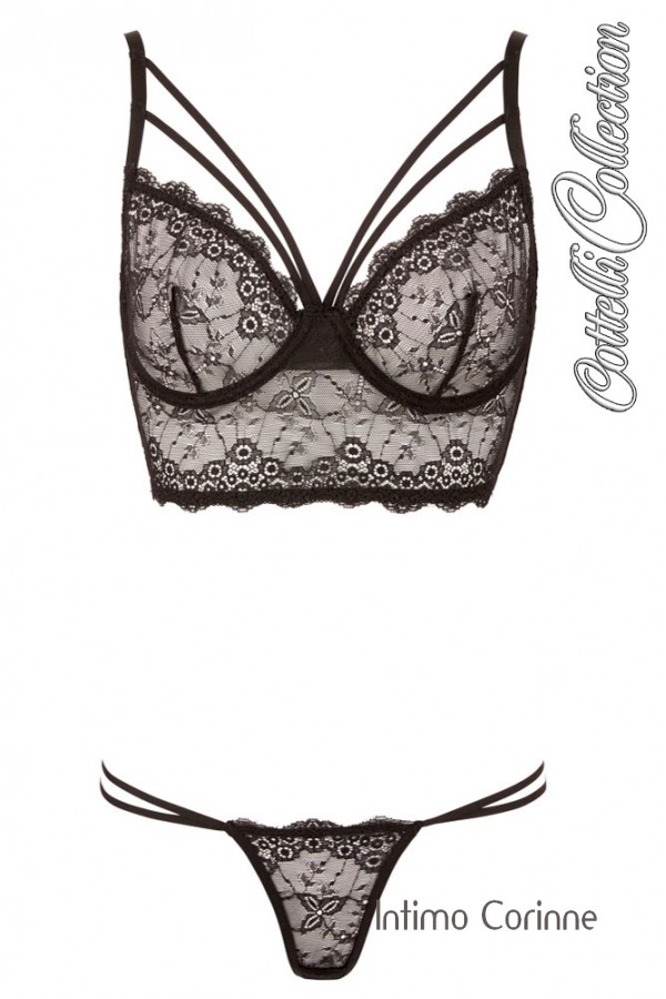 Set 2 pezzi in pizzo con stringhe decorative sul decolletè.