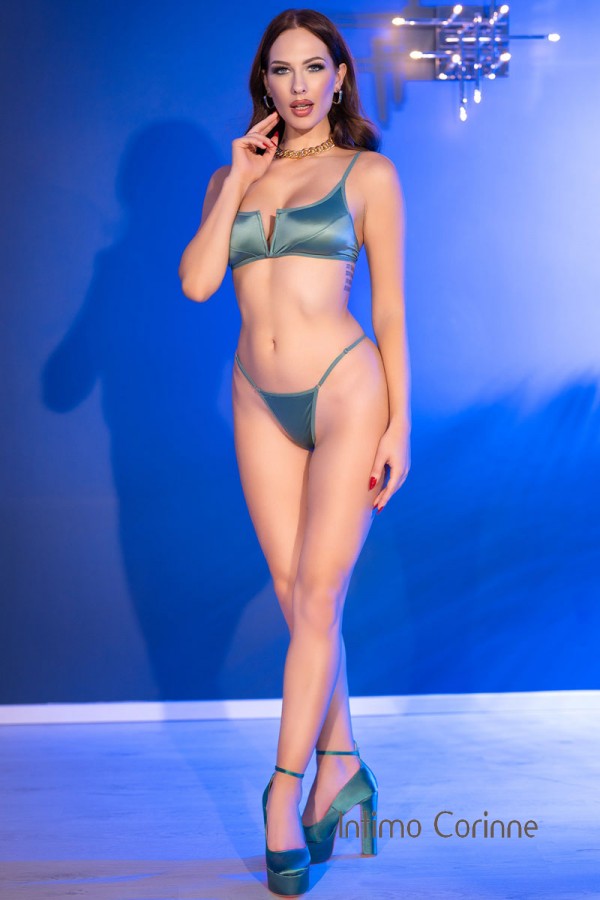 Completo intimo 2 pezzi in morbido tessuto satin verde menta, setoso e piacevole al tatto. Reggiseno morbido con ferretto a V al centro, chiusura posteriore con gancetto metallico e spalline regolabili. Tanga coordinato con fianchetti regolabili. Può essere usato anche come costume da bagno.