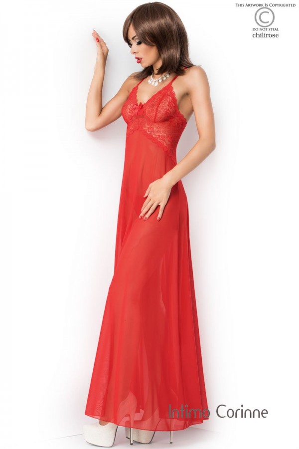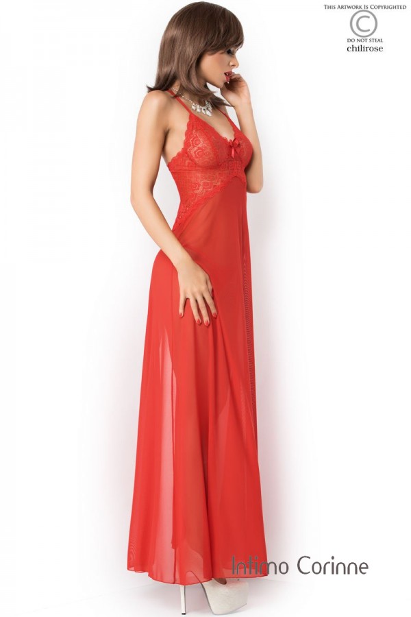 Lungo abito rosso da camera in morbida microrete con coppe e fascia superiore in pizzo. Spalline regolabili ad incrocio e profondo spacco posteriore. Include tanga.