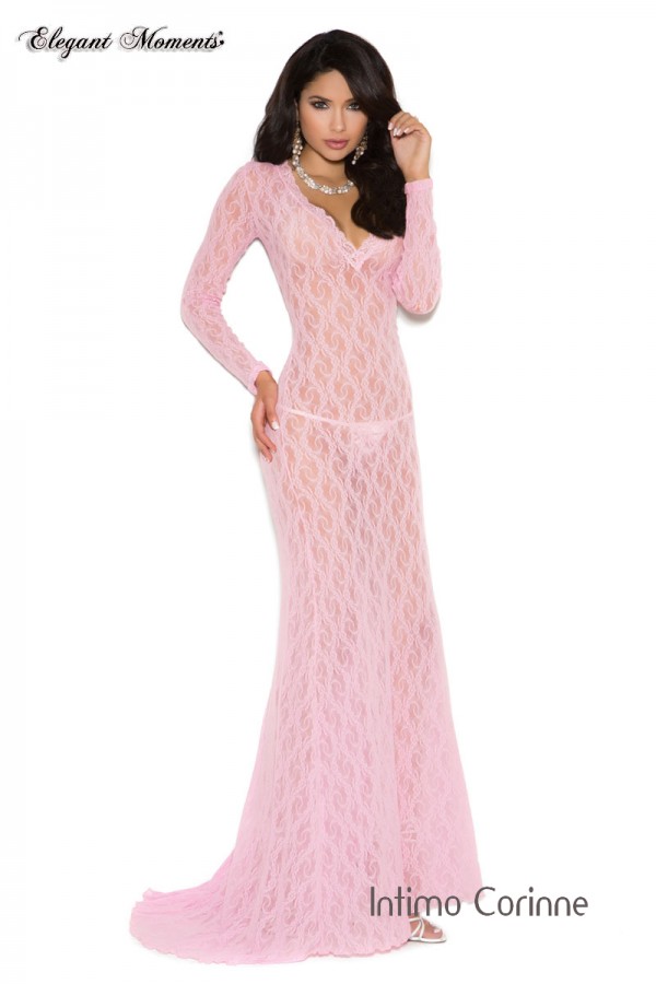 Bellissimo abito lungo color rosa confetto in morbido pizzo floreale con profonda scollatura a V, maniche lunghe e piccola coda posteriore.