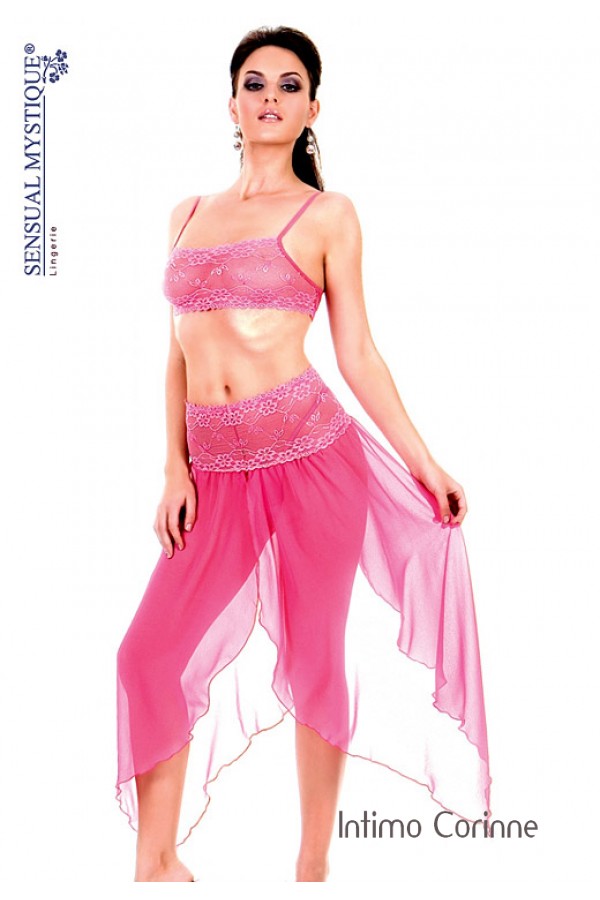 Elegante completo con top ricamato in morbido pizzo e gonna con fascia superiore in pizzo e parte inferiore in veli di chiffon. Incluso perizoma coordinato con tassello in cotone.