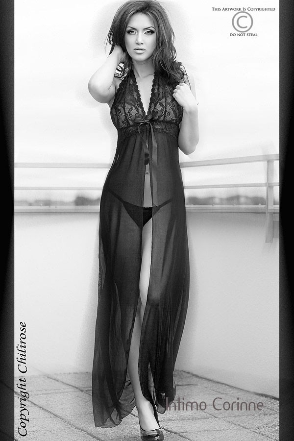 Raffinata vestaglia lunga nera in soffice chiffon con coppe in pizzo ricamato. Legatura con nastro all'altezza del seno e aperta  per il resto della lunghezza. Perizoma coordinato incluso.