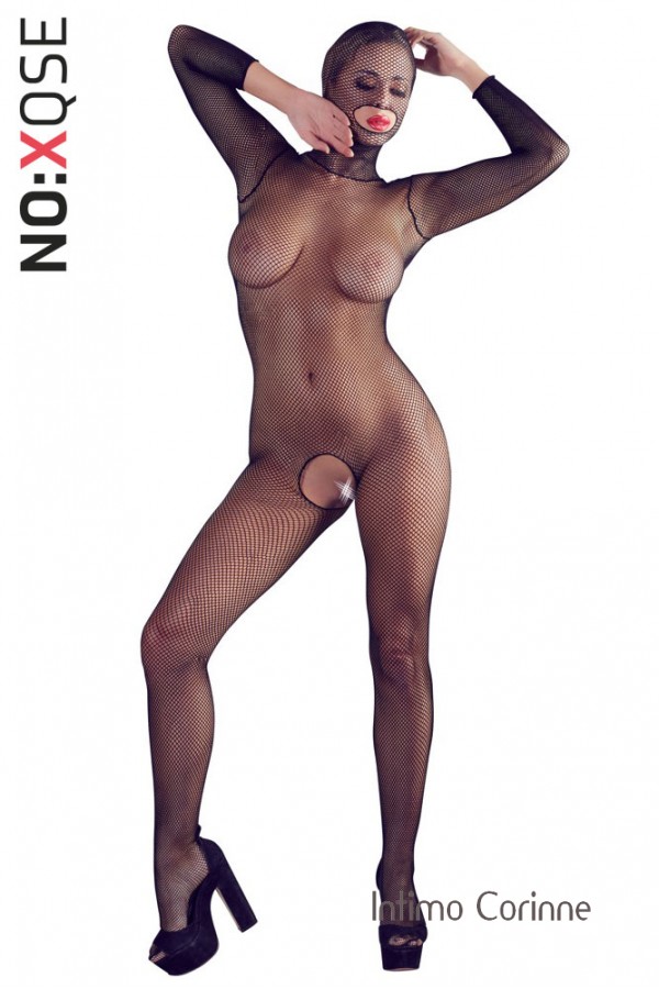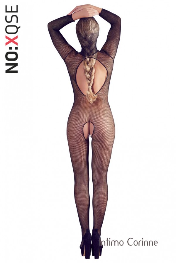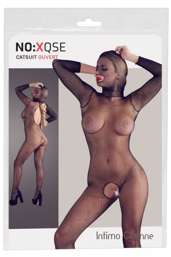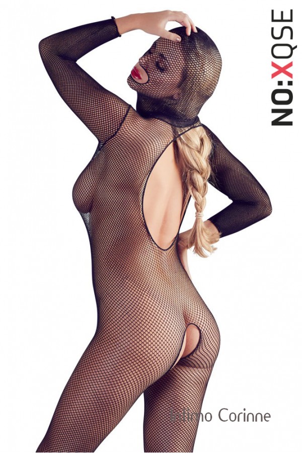 Catsuit in morbida rete nera elasticizzata con annessa una maschera integrale aperta solamente sulla bocca, maniche a 3/4 e cavallo totalmente aperto. L'ampia apertura sulla schiena, oltre ad essere molto sensuale, serve per poter indossare la tuta.